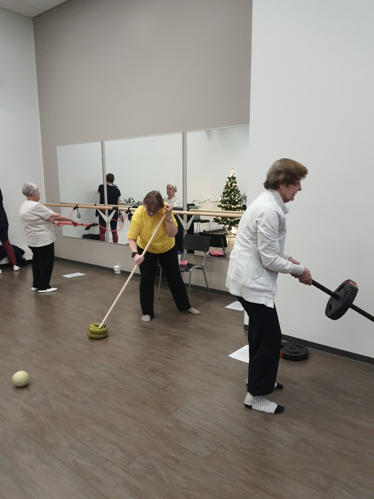 Voimavara-ryhmässä korostetaan harjoittelun käytännönläheisyyttä. Tehdään oikeasti niitä liikkeitä, joita jokapäiväisessä elämässä täytyy jaksaa tehdä. Noustaan istumasta seisomaan, kannetaan kauppakasseja, nostetaan tavaroita lattialta, vedetään ruohonleikkuri käyntiin, työnnetään ostoskärryjä. Ja erityisesti harjoitellaan lattialta ylösnousemista. Harjoitteet on helppo siirtää ryhmästä kotiin.